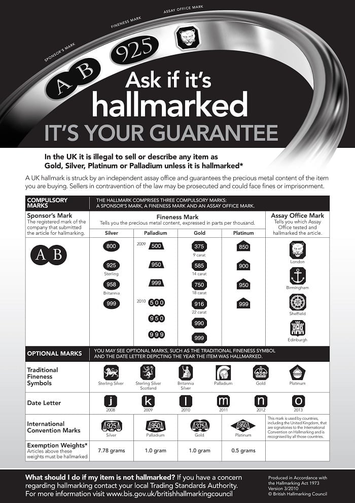 In the UK we have a strict system for marking genuine gold items using hallmarks. This provides an easy identification system for buyers and sellers to understand. These hallmarks include the carat value and the Assay Office mark where the item was tested and marked. In the UK you will often see the hallmark “375” for 9ct, and “750” for 18ct. You can see the full hallmark chart below.
